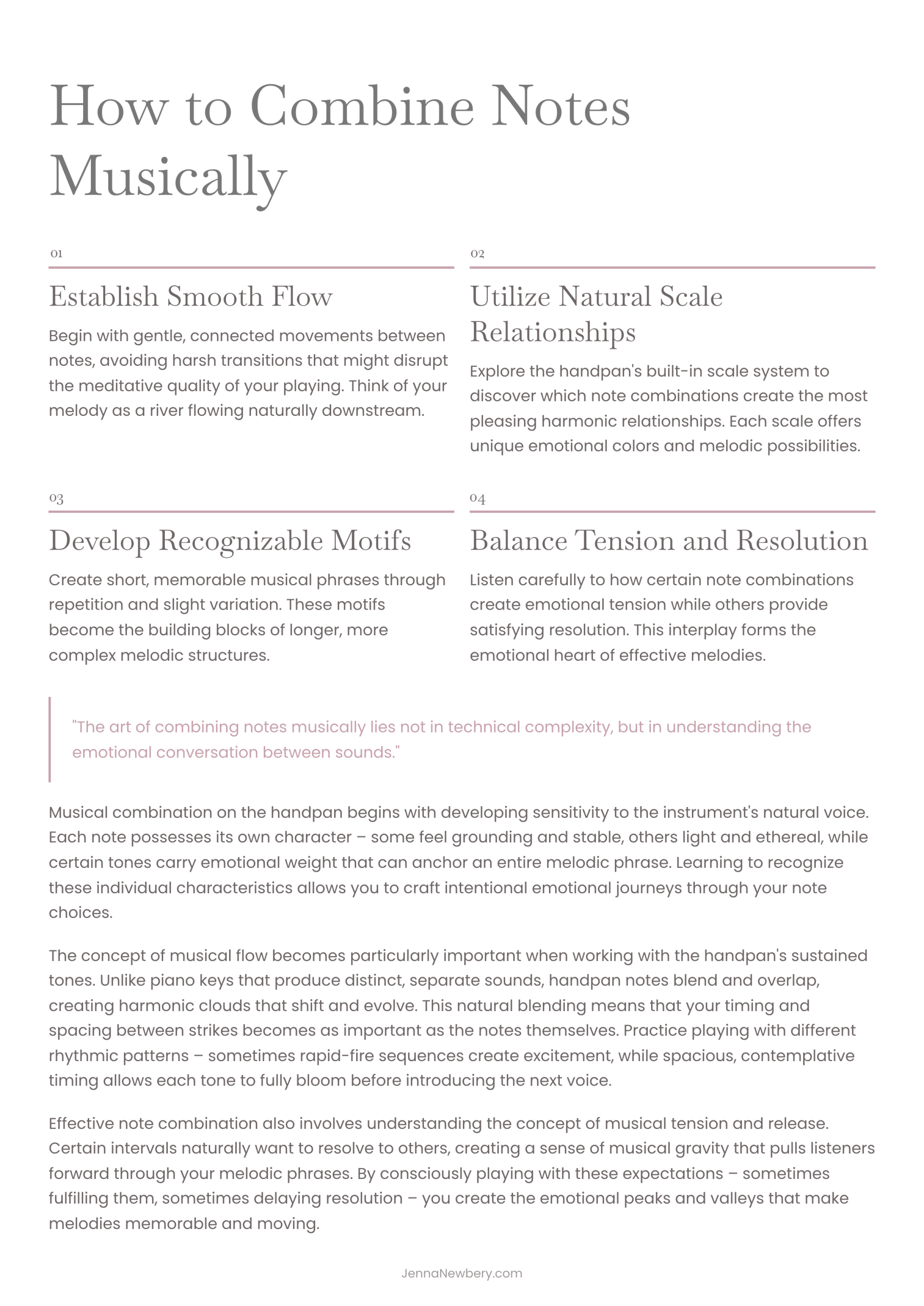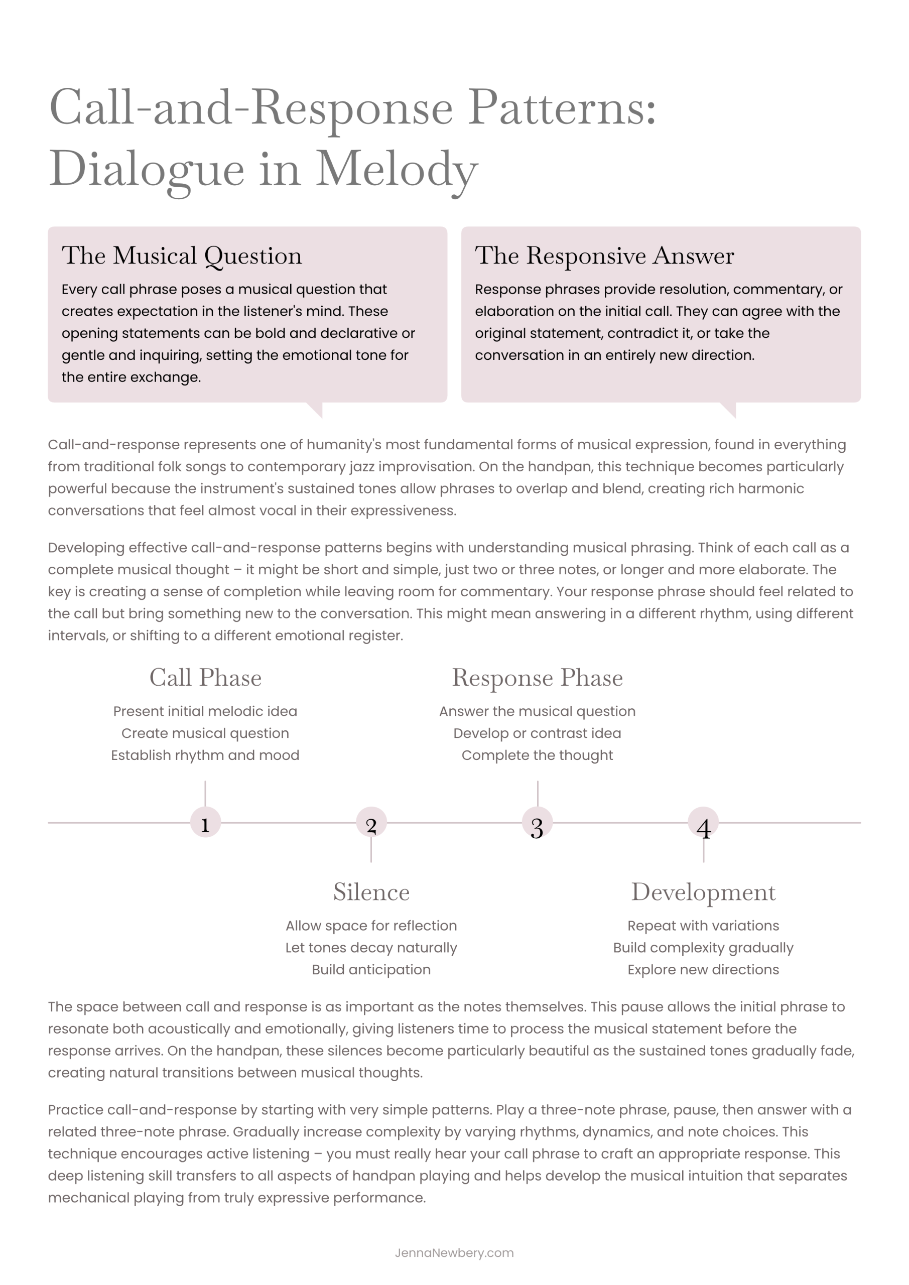This guide explores how the handpan’s intuitive design and harmonic structure naturally lead you toward meditative, flowing melodies. You’ll learn how to create musical stories with emotion and grace — whether through stepwise movement, interval leaps, or call-and-response phrasing — while developing the sensitivity and awareness that make every note come alive.